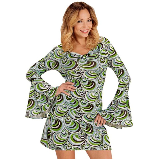 Sukienka z długimi rękawami rozszerzającymi się na zasadzie dzwonu.