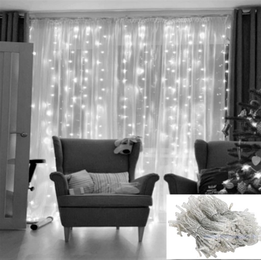 Lampki - kurtyna świetlna (z dużą ilością sznurów świetlnych) w kolorze zimnej bieli o rozmiarze świetlnym 6 x 3 m. + PILOT ZDALNEGO STEROWANIA