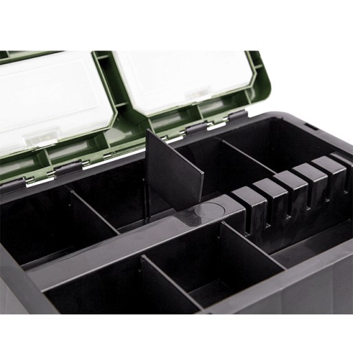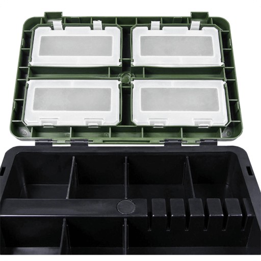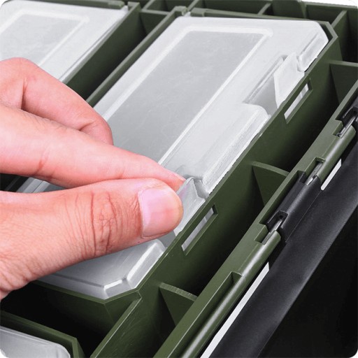 Pokrywa skrzyni została wyposażona w cztery zamykane pudełka, które umożliwiają bezpieczne przechowywanie mniejszych akcesoriów. Dzięki temu istnieje możliwość precyzyjnego uporządkowania haczyków, przynęt, lub innych drobnych elementów wyposażenia. Zamykane pudełka dodatkowo chronią zawartość przed wpływem warunków atmosferycznych, co jest istotne zwłaszcza podczas deszczu czy silnego wiatru.