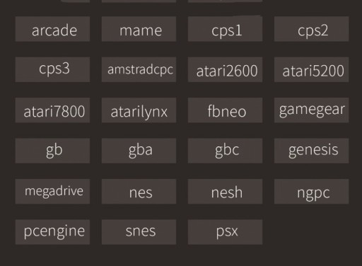 arcade/mame/cps1/cps2/cps3/amstradcpc/atari2600atari5200/atari7800/atarilynx fbneo/gamegear/gb/gba/gbc/genesis/megadrive/nes/nesh/ngpc/pcengine/snes/psx