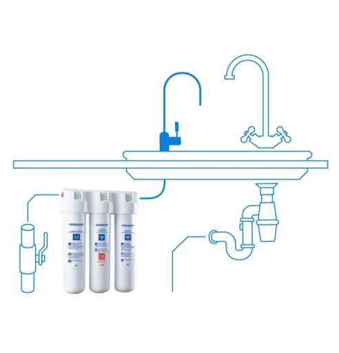Instalacja filtra jest dość prosta. Musimy znaleźć odpowiednie miejsce w szafce kuchennej i podpiąć się pod zawór z zimną wodą. W zestawie jest trójnik z zaworkiem (przyłącze wody) za pomocą którego wpinamy się do naszej instalacji i mamy odprowadzenie wody do filtra.