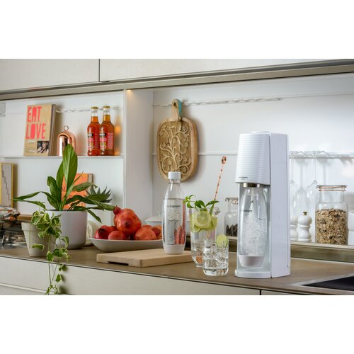 Saturator do wody SodaStream Terra w kolorze białego matu, idealnie pasuje do każdego wnętrza, zarówno Twojej kuchni jak i pomieszczenia biurowego. Bąbelkowa woda z saturatora jest doskonałą alternatywą dla napojów gazowanych w plastikowych butelkach jednorazowych ze sklepu, które dodatkowo zabierają Ci miejsce.