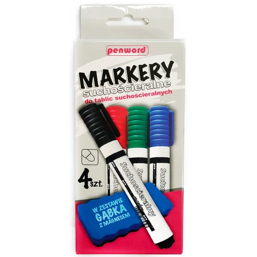 Zestaw Markerów Suchościeralnych 4 kolory z gąbką z magnesem Penword