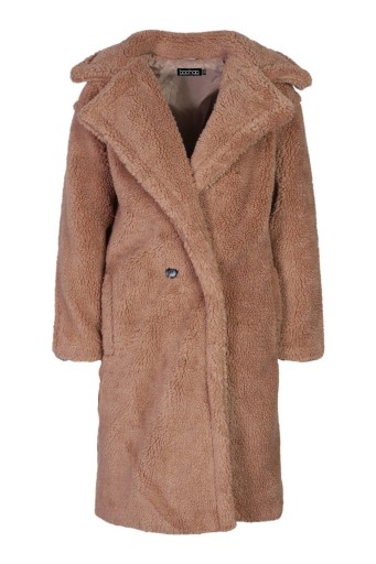 КОРИЧНЕВОЕ КЛАССИЧЕСКОЕ ПАЛЬТО ТЕДДИ С ДЛИННЫМИ МЕХОВЫМИ КАРМАНАМИ BOOHOO 36