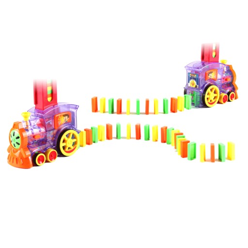 - Kolorowa lokomotywa buduje rzędy kostek domina, które potem można pięknie zburzyć i jeden za drugim z klocków będzie upadał. Wystarczy naładować magazynek, dołączony do zestawu, wcisnąć guzik, a lokomotywa porusza się w przód, zostawiając za sobą ułożone pionowo klocki domina.