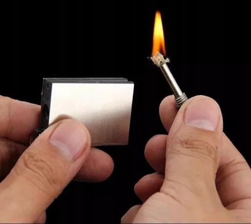 ✅Zasada działania jest bardzo prosta! Wystarczy częściowo napełnić pojemnik łatwopalną cieczą (np. naftą czy benzyną), zanurzyć metalową zapałkę w pojemniku, a następnie energicznie pocierać stalową końcówką zapałki o rdzeń aby wywołać iskry i spowodować zapłon.