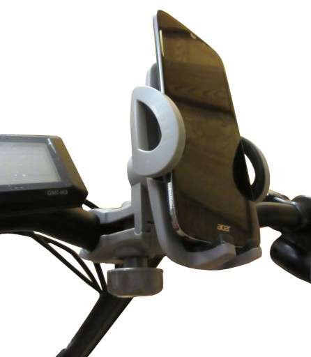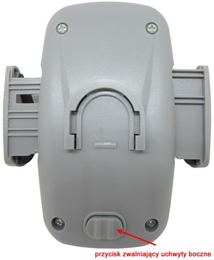 Uchwyt posiada boczne zaczepy do trzymania telefonu. Możliwa jest regulacja ich rozstawu, by uchwyt pasował do dowolnego rozmiaru telefonu. Boczne zaczepy zwalnia się naciskając przycisk z tyły uchwytu. Nie należy zaczepów rozciągać na siłę !!! Po włożeniu telefonu ręcznie je dociskamy, by ściśle obejmowały aparat.