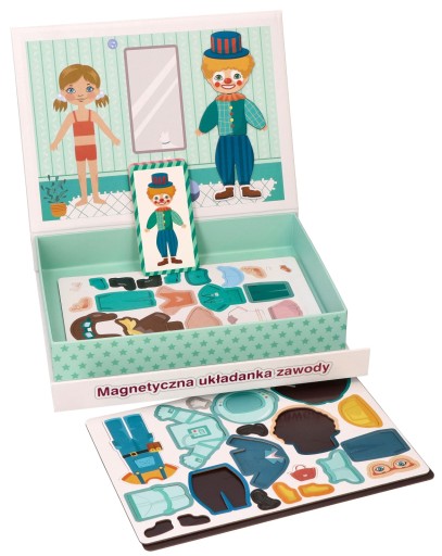 - Zestaw składa się z 74 sztuk magnetycznych elementów stroju i akcesoriów, oraz 12 kolorowych kart z wizerunkami chłopców i dziewczynek.