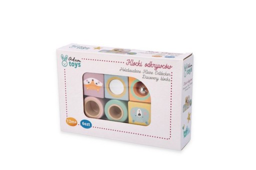 - 4 sześcienne klocki o boku 4 cm, w tym: żółty klocek sześcienny z Misiem Rysiem, zawierający grzechoczące ziarenka, które interesująco brzęczą fioletowy klocek sześcienny z Lisicą Kitką, w którego środku znajdują się elementy, generujące przyjemne dźwięki pomarańczowy klocek sześcienny z lśniącym, metalowym dzwoneczkiem, który pozwala na delikatne dzwonienie niebieski klocek z elementami lusterkowymi, oferujący możliwość obserwacji odbić