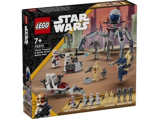 Zainspiruj dzieci do odtwarzania ekscytujących scen z serialu Gwiezdne Wojny: Wojny klonów dzięki zestawowi bojowemu LEGO® Star Wars™ z żołnierzami armii klonów™ i droidami bojowymi™ (75372) dla dzieci w wieku od siedmiu lat. Zawiera on cztery minifigurki LEGO Star Wars i pięć figurek LEGO — klona z oddziału uderzeniowego, trzech żołnierzy-klonów, trzy superdroidy bojowe i dwa droidy bojowe — a także kultowe bronie. Ten zestaw LEGO zawiera także ścigacz z Gwiezdnych Wojen z miotaczem klocków dla dwóch żołnierzy-klonów oraz ścigacz STAP do zbudowania dla droida bojowego. Tri-droid z trzema miotaczami pocisków i stanowisko defensywy z miotaczem klocków zapewniają jeszcze więcej kreatywnych możliwości zabawy.