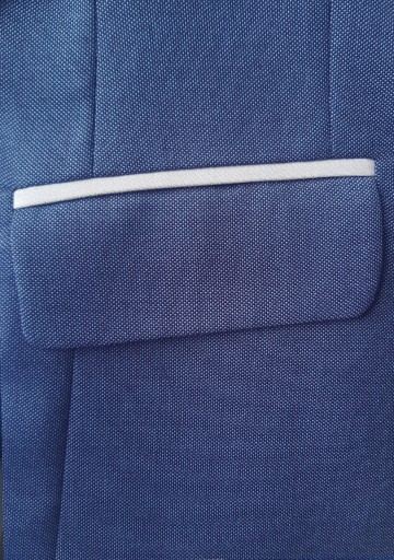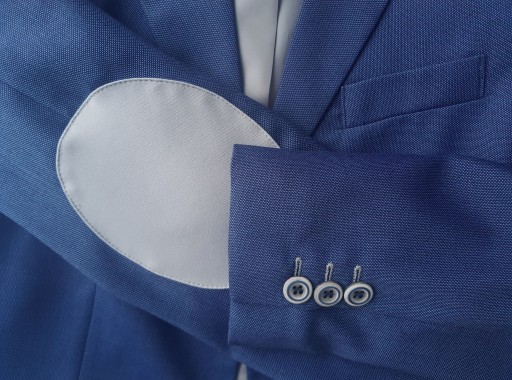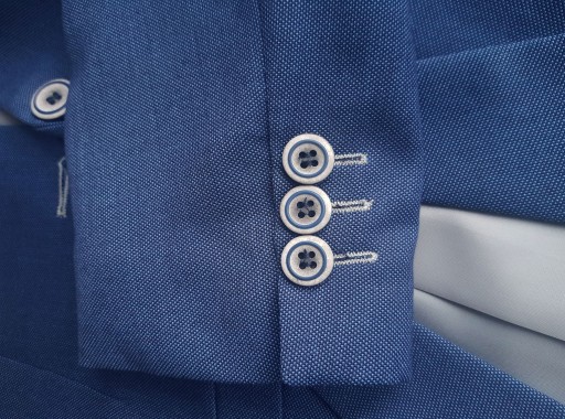 Marynarka chłopięca jasno granatowa, tkanina marynarkowa melanż, na jasno szarej podszewce, z tyłu dwa rozcięcia, kieszonka piersiówka, marynarka jest zapinana na dwa guziki, jasno szare łaty na rękawach oraz wypustki przy kieszonkach, guziki w kolorze szarym, obszycia dziurek w kolorze szarym. Doskonała jakość
