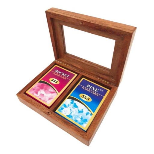 Dwie talie kart w drewnianym pudełku ze szklanym topem