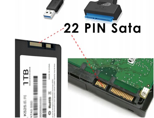 - Adapter wyposażony w złącza: 1x SATA 22pin, 1x USB.