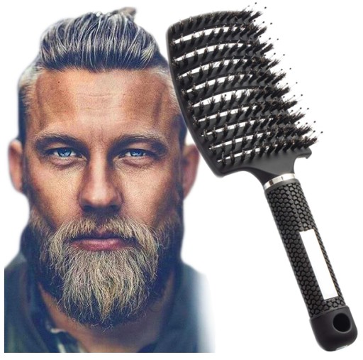 Męska szczotka. Powierzchnia rozczesująca szczotki jest odpowiednio szeroka oraz wygięta, aby właściwie dopasowywać się do anatomicznych kształtów głowy. Szczotka posiada gęsto rozstawione nylonowe igiełki rozczesujące, zakończone kuleczkami, dzięki czemu są łagodne dla skóry głowy i dodatkowo ją masują.