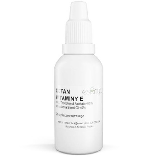 - Sugerowane stężenie w kosmetykach do 5 %, octan witaminy znakomicie rozpuszcza się w tłuszczach (olejach, masłach kosmetycznych itp.), nie rozpuszcza się w wodzie.
