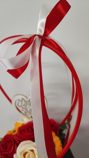 Ozdobne pudełko w kształcie koszyczka w kolorze czerwonym pikowane i wypełnione 7 kwiatami z mydła to znakomity prezent dla każdej kobiety ...który sprawi obdarowanej osobie mnóstwo pachnącej radości...