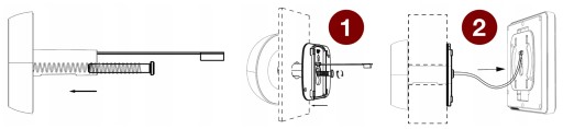 - Zamontuj ramkę na drzwiach. Dokręć śrubę w celu stabilizacji wizjera i metalowej ramki. Wepnij złącze sygnałowe do gniazda w wyświetlaczu oraz nasuń wyświetlacz na ramkę na drzwiach.