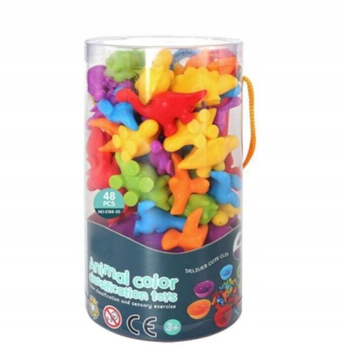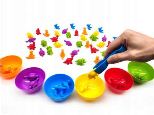 Dziecko może za pomocą plastikowej pęsety segregować kolorystycznie do 6 miseczek tęczowe dinozaury. Może je dzielić po kolorach, a także kształtach. To wspaniała nauka liczenia, dodawanie i odejmowanie będzie proste i przyjemne.