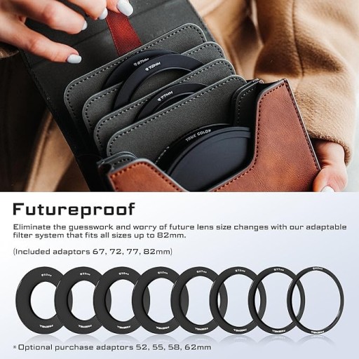- Kompatybilność adaptery 52 mm, 55 mm, 58 mm, 62 mm, 67 mm, 72 mm, 77 mm, 82 mm i filtry Gradient, Mist, Steak, ND
