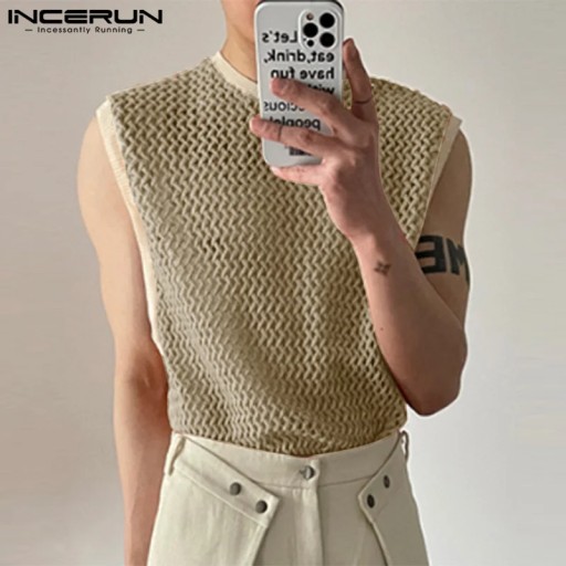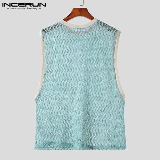 2023 Men Tank Tops Patchwork Mesh Transparent Lace Streetwear O-neck Sleeveless Vests Sexy Fashion Men Clothing S-5XL INCERUN 7