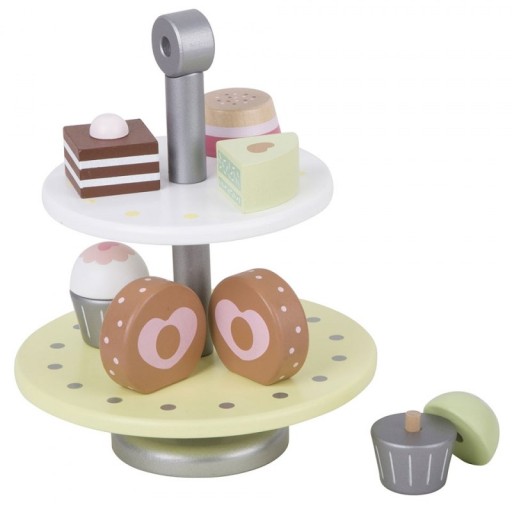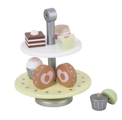 Zestaw zawiera drewniany stojak (paterę) oraz 6 różnych babeczek i ciast. Babeczki składają się z dwóch części, dzięki czemu można je dowolnie łączyć, tworząc różne kombinacje.