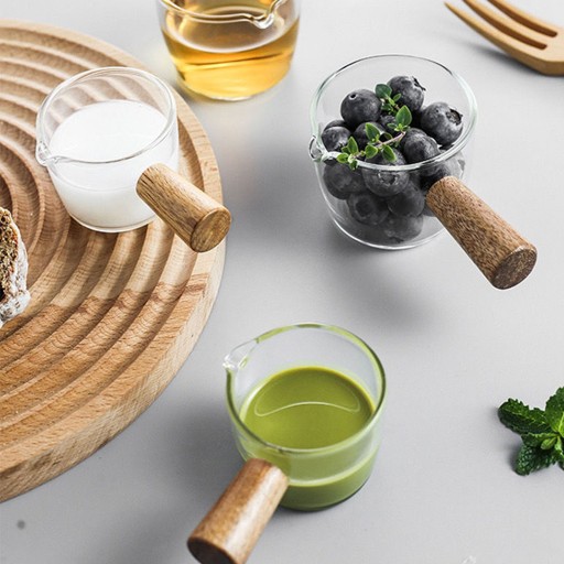 Mini szklana miarka o pojemności 50 ml z pojedynczą wylewką, miarka do kawy, kieliszek do kawy z drewnianym uchwytem do śmietany mlecznej