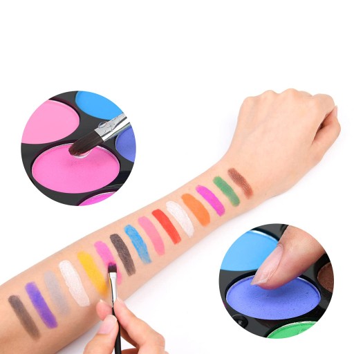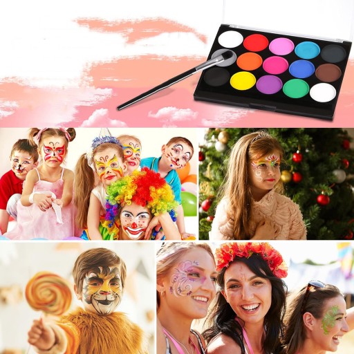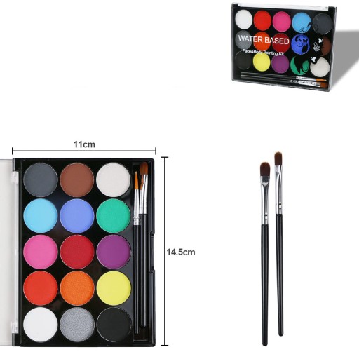 - Te kolory do malowania ciała i makijażu karnawałowego zawierają 15 różnych kolorów i 2 pędzle malarskie,