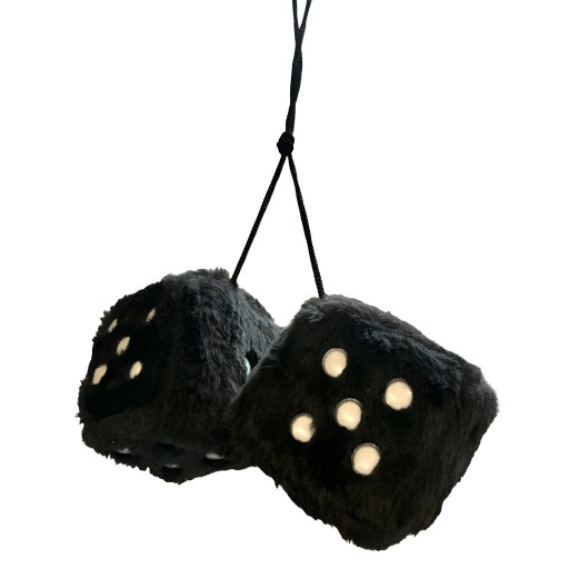 KOSTKI PLUSZOWE DO SAMOCHODU CZARNE ZAWIESZKA NA LUSTERKO SZYBĘ PRZYSSAWKA