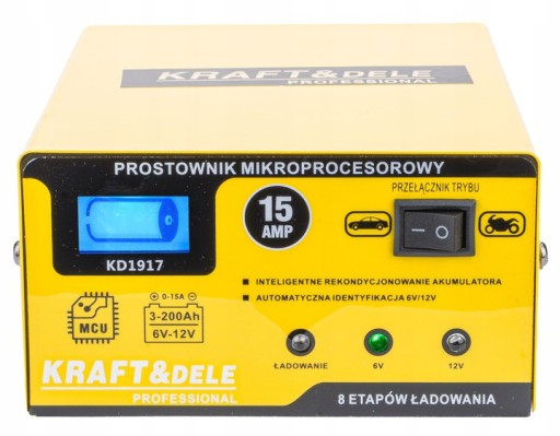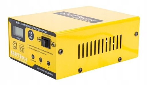 Prostownik mikroprocesorowy KD1917 Polskiej firmy Kraft&Dele to niezawodne urządzenie prostownikowe do ładowania wszystkich typów akumulatorów kwasowo-ołowiowych (WET/MF/CA/EFB/GEL/AGM). Czas ładowania akumulatora zależy od jego pojemności znamionowej i stopnia rozładowania.