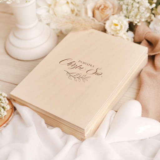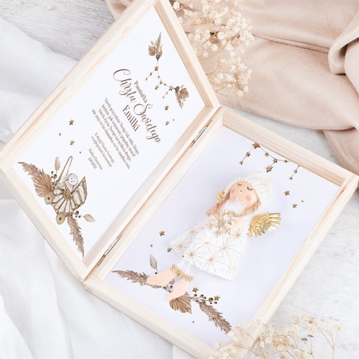 Pamiątka chrztu, umieszczona w drewnianej szkatułce z grawerem na wieczku, jest niezwykle wyjątkowa.