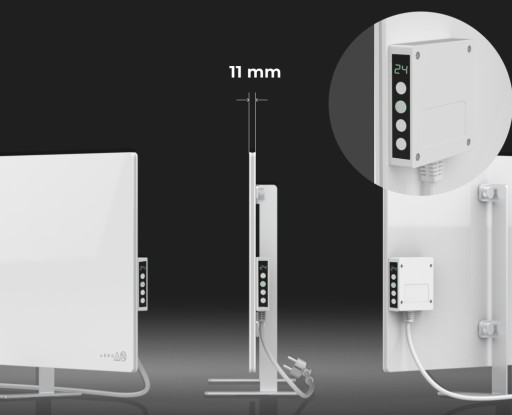 Jego cienki, wytrzymały panel grzewczy o grubości zaledwie 11mm sprawia, że urządzenie jest nowoczesne i uniwersalne, łatwo dopasowując się do Twojego wnętrza. Montaż jest niezwykle prosty – możesz go zawiesić na ścianie lub postawić na podłodze, zarówno w pozycji pionowej, jak i poziomej.