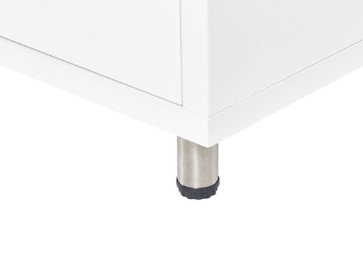 Ta szafka pod telewizor w stylu Skandynawskim to mebel, którego potrzebuje każdy salon. Zapewnia dużo miejsca na wszystkie drobiazgi i urządzenia elektroniczne. Wykorzystaj miejsce na otwartych półkach na rzeczy, które wymagają podłączenia do gniazdka, a wszystkie inne przedmioty przechowaj w jednej z dwóch szafek lub szuflad. Szafka posiada białe fronty o wysokim połysku oraz srebrne nogi, które nadają jej stylowego, nowoczesnego wyglądu.