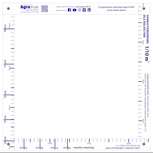 Ramka pomiarowa dla rolnictwa 1/10 m2 służy do pomiaru wschodów roślin, określenia liczby chwastów i uszkodzonych roślin. Rozstaw rzędów między 10 a 18 cm. Instrukcja dot. pomiarów zapisana na ramce.