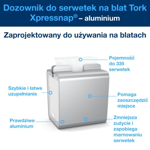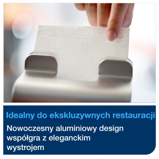 Dozownik z linii Tork Xpressnap® to produkt stworzony z troską o każdy szczegół. Nowoczesny projekt bazujący na lekkim aluminium, łączy w sobie funkcjonalność i stylowy, nowoczesny desing, dzięki którym Twój lokal pozostawi po sobie nieodparte wrażenie profesjonalizmu.