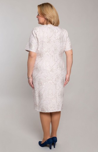 Sukienka, o klasycznym kroju, wykończona jest oryginalnym dekoltem z perłową przypinką i krótkimi rękawkami. Nie posiada poduszek na ramionach. Na plecach ma umieszczony kryty zamek błyskawiczny, co znacznie ułatwi jej dopasowanie do sylwetki. Zaś wszyta podszewka zwiększa komfort użytkowania. Sukienka posiada również klasyczny rozporek, dzięki któremu nie będzie krępowała ruchów podczas poruszania się.