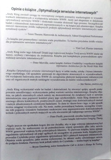 Celem optymalizacji witryny WWW jest przede wszystkim maksymalizacja przychodów z serwisu i podniesienie komfortu użytkowników. Aby ten cel osiągnąć, trzeba spełnić kilka podstawowych warunków. Po pierwsze należy zadbać o to, aby serwis można było łatwo odszukać w sieci. Po drugie korzystanie z niego nie może sprawiać trudności, a po trzecie powinien on być szybki, atrakcyjny i interaktywny. Krótko mówiąc, dobry serwis musi być funkcjonalny i wydajny. Aby osiągnąć sukces w sieci, należy, zatem wybrać właściwe metody i przyjąć skuteczną strategię działania. Jakie to techniki i jak je stosować, dowiesz się właśnie z tej książki.