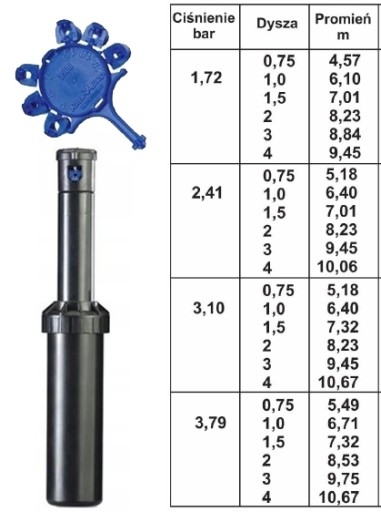 Wymiana dysz umożliwi sprawne ustawienie zasięgu nawadniania danego zraszacza - zakres regulacji to 4,6 do 10,7mb