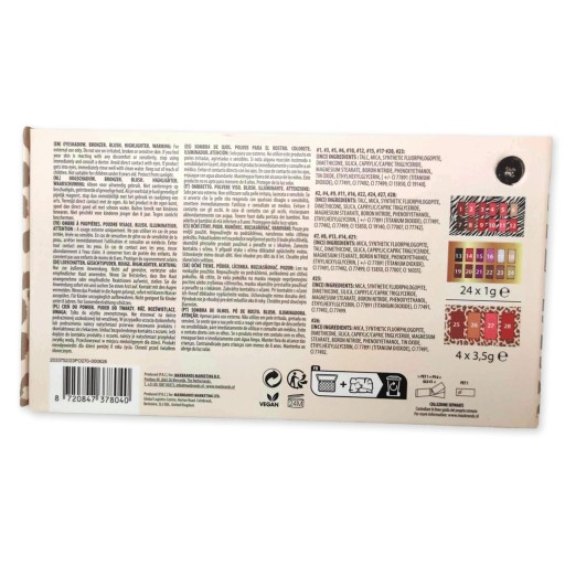 Waga produktu: 24x1g (cienie), 4x3,5g (pozostałe kosmetyki)