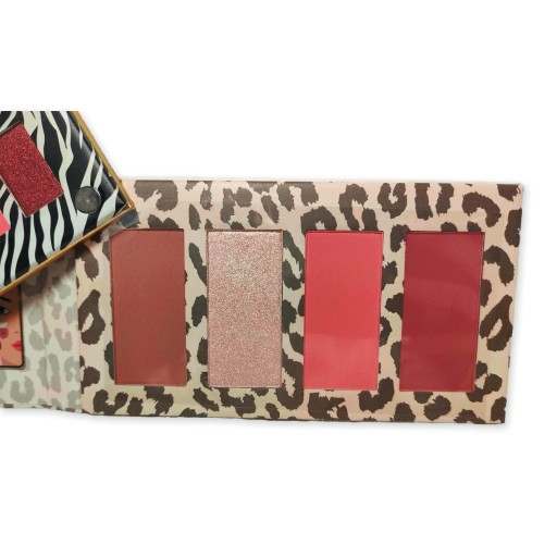 Znajdziesz w niej cienie do powiek, bronzer do twarzy, rozświetlacz oraz róże do policzków.