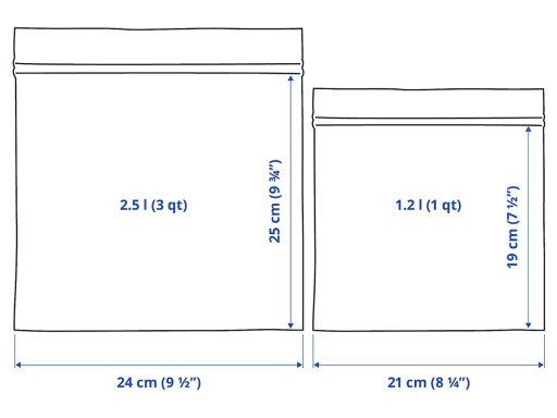 - 25 torebek 2,5 l (wymiary wewnętrzne 24x25 cm) i 25 torebek 1,2 l (wymiary wewnętrzne 19x21 cm).