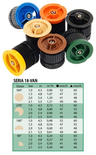Dysze te są wprost idealne do nawadniania terenów zieleni o nieregularnym ukształtowaniu powierzchni a także krzewów ze względu na łatwość regulacji sektora nawadniania. WŁAŚCIWOŚCI : Dysze oznaczone kolorami, co umożliwia łatwą identyfikację promienia i sektora.