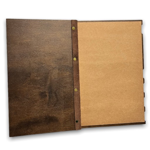 Zestaw składa się z dwóch sklejek brzoza połączonych zawiasem skórzanym nitowanym oraz wkrętami introligatorskimi umożliwiającymi łatwe rozkręcanie i wymianę zawartości menu.