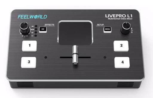 LIVEPRO L1 to mikser, dzięki któremu można tworzyć produkcje z użyciem wielu kamer. Umożliwia streamowanie dowolnego sygnału z czterech wejść HDMI na dowolnej platformie do transmisji na żywo za pośrednictwem zewnętrznego oprogramowania do streamingu, np. OBS. Wystarczy podłączyć mikser Feelworld L1, by na żywo przełączać się między czterema źródłami wysokiej jakości sygnału wideo, uzyskując obraz znacznie lepszej jakości. Można również podłączyć komputer, aby wyświetlić prezentację programu PowerPoint lub obraz z konsoli do gier.