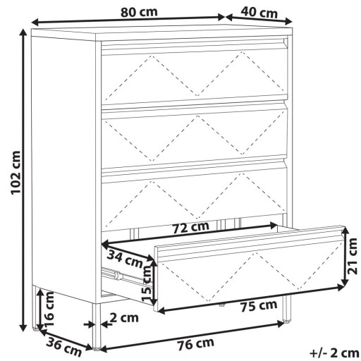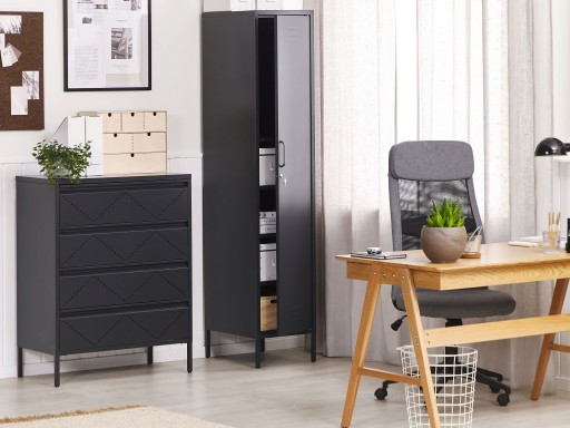Nowoczesna, funkcjonalna, jak i stylowa, ta szafka to najlepszy wybór w kwestii przechowywania. Cztery szuflady sprawdzą się do przechowania ubrań, dokumentów czy innych drobiazgów. Perforowany wzór w romby na frontach podkreśla industrialny styl mebla. Ta pojemna komoda doskonale uzupełni każde pomieszczenie w domu, biuro, sypialnię czy salon. Zarówno jej malowana proszkowo powierzchnia, jak i solidna metalowa konstrukcja zapewniają trwałość i łatwość pielęgnacji.