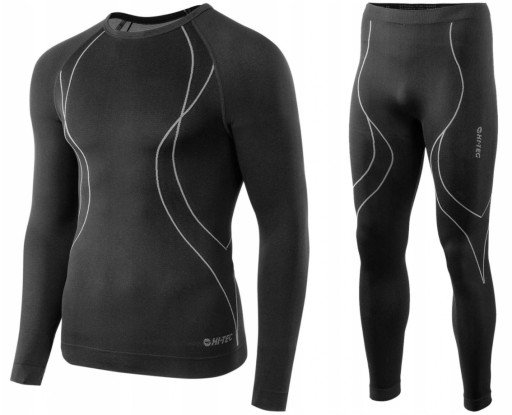 Komplet męskiej bielizny termoaktywnej Hi-Tec w kolorze czarnym. Jest wygodny i trwały, lekki materiał pozwala skórze oddychać i świetnie pomaga utrzymać temperaturę ciała.
