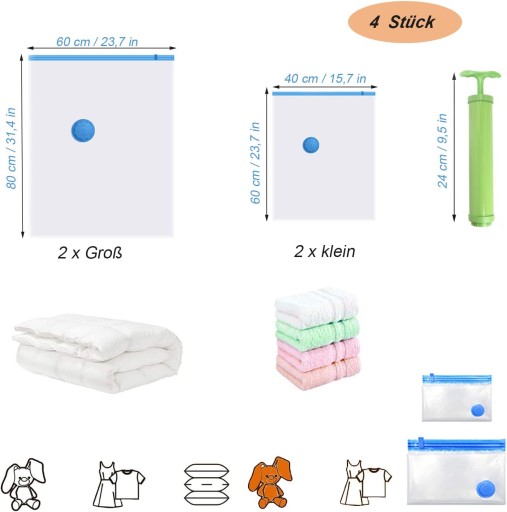 Informacje o tym produkcie Nadaje się do pościeli, poduszek, ubrań, kołder, swetrów itd. 3 różne rozmiary, 80 x 60 cm, 70 x 50 cm, 60 x 40 cm, dużo, aby spełnić różne wymagania dotyczące przechowywania. Dwustronne listywyłączające skutecznie blokują wnikanie powietrza i zapobiegają emitowaniu powietrza. Zabezpieczenie suwaka, aby zabezpieczyć się, że zamek jest szczelny. Wykonanie z pozostałości, pozostałości na wilgoć, zniszczenie, rozerwanie i czyszczenie urządzeń użytkowych. Opis produktu