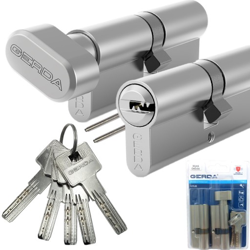 Komplet dwóch wkładka Gerda H Plus w systemie jednego klucza w rozmiarze 30/35 mm, w tym jedna z gałką po stronie 35 mm, certyfikat, klucz symetryczny nawiercany.
