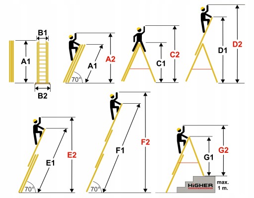 Największą zaletą drabin 3-elementowych jest ich uniwersalność. Drabina HIGHER posiada aż 7 różnych zastosowań, co sprawia, że znajduje bardzo szerokie i różnorodne zastosowanie. Przykłady zastosowań oraz parametry techniczne prezentuje poniższy schemat.