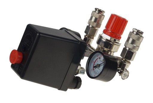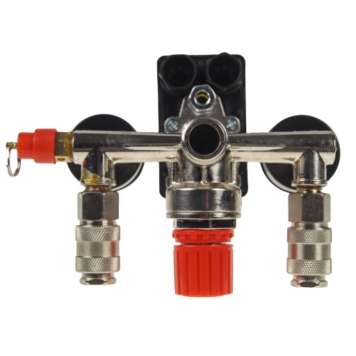 Wyłącznik posiada zawór ułatwiający rozruch sprężarki - upuszcza ciśnienie z kolektora tłoczącego. Ciśnienie w zbiorniku utrzymuje zawór zwrotny. Na reduktorze pracuje szybkozłączka europejska z lewej strony. Dodatkowo kolektor rozdzielczy jest z zabezpieczeniem reduktora ciśnienia.