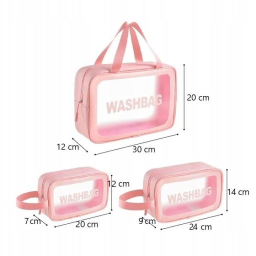 Kosmetyczki mają wygodne paski i uchwyty (jak przedstawiono na zdjęciach). Największą kosmetyczkę z długimi paskami można wygodnie zawiesić na ramieniu na torebkę, a mniejsze łatwo przenosić za pomocą uchwytów.